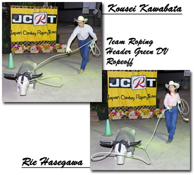 LTD Non Pro DVを制したのは昨年Green DVから昇格した佐々木寧騎乗のMr Topsail Whiz。このDVでの勝敗を分けたのは、それぞれの競技馬のパフォーマンスの精度の差ではなく、いかにペナルティを最小限に抑えた丁寧な演技をしたかだ。初級者のDVでライダーの丁寧さが勝利を導いたことは、これから生まれてくるツーハンドのDVのライダーにとって良き模範となる演技だった。 Team Roping Header Green DVは二者の接戦となった。1投目で川畑弘清がホーンに一直線に走るスローでプラス1/2を獲得し、スコア145.0とトップに出る。しかし2投目でローピング初参戦の長谷川里絵がスイング・スロー共にプラスを獲得し、146.0と逆転。続く川畑が食らいつき、トップタイとなりロープオフへ。先攻の長谷川がホーンを外すと、後攻の川畑は確実にホーンをキャッチ。ローピング2年目の川畑が初のバックルを手にした。