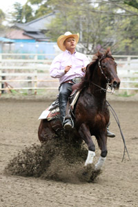 大会2日 午前中は、アンシラリークラスが行われた。 多くの選手がスクーリングを兼ねたショーイングをする中で、目を引いたのが早見秀代とSmart Roosterのコンビで、サークルの大きさやリードチェンジの時のレインハンドの荒っぽさが少しだけ改善された感があって、好感を抱かせてくれた。今後のパフォーマンスに注目したいところだ。 Openは、初日トップに立ったJac In The Moneyが順当なパフォーマンスで、本来なら間違いなく優勝となるところだったが、落とし穴が潜んでいて5スピンでペナルティ0となって、Miss Top Sailenが優勝を掠った。