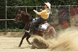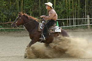 大会を通して、天候に恵まれベストコンディションのもと展開された。 One Day Before Ancillary 4月17日(水曜日) 本番を控えたスクーリングのクラスで、Non Pro DVで2エントリー、Open DVで1エントリーがあり、Non Pro の2頭は、スクーリングに徹してスコア0。 Openは、Senoritas Nicky 土岐田 勘次郎(千葉県) オーナー 石山 尚子(千葉県) が72.0ポイントを獲得した。 The Day 1st 4月18日(木曜日) Non Pro DV 1stGo Round Moonlights Sailor 石山 真実(千葉県)は、このカップリングで初の出場であったものの、スピンとサークルで積極的パフォーマンスにより+1/2を獲得し、リーディングスコア206.5ポイントで幸先の良いスタートを切ることができたようである。 これに並んだのが、Lil Ruf Whip 落合 身知子(埼玉県)で、安定したマインドの特長を活かしサークルのスピードの緩急を見せた。 Open DV 1st Go RoundChic Top Cody 土岐田 騰馬(千葉県)が、スピンとサークルは+1 ストップは+1/2と如何なくこの馬の能力を発揮して219.5ポイントを獲得し、独走状態となった。 独走を許さじと挑んだのが、Eighty Six Classic 袴田 桂子(千葉県) オーナー 磯野 ひろ子(千葉県)、211.0ポイントと首位に及ばずとも2位の位置につけた。 The Day 2nd 4月19日(金曜日) Ancillary Class Non Pro DV Whizlin Whoaman 諸岡 辰浩(千葉県)が、69.0ポイントほぼアベレージスコアをマークした。今回は、日程の都合で本戦の出場が叶わなかったが、次回に繋がるスコアをマークした。 Ltd Non Pro DV チャンピオンに輝いたのは、La Tigre Del Cielo 石塚 泰子(千葉県)で、演技中に何度かスティラップが外れるというアクシデントがあったが、積極的パフォーマンスで栄冠に輝いた。 リザーブチャンピオンは、Eighty Six Classic 磯野 ひろ子で、少々ロングリードによるペナルティが嵩み、チャンピオンに一歩及ばずであった。 The Day Final 4月20日(土曜日) Non Pro DV 2nd Go Round 1stGo でトップタイとなった2頭に注目が集まったものの、ノンプロクラスの上位3頭は、何と210.0ポイント越えを果たしたのである。 ノンプロにエントリーした馬の多くが、スピンやサークルのスタイルとレベルの向上が見られて、オーディエンスの歓声を一層大きくさせていた。 Remarkable Steps増田 明子(千葉県)は、本人の肢の故障や外遊で練習不足は否めなかったが、1stGo ではペナルティが嵩んでスコアが振るわなかったものの2nd Goでは見事に挽回し212.0ポイント獲得して3位を獲得した。 1st Goでトップタイにつけていた Lil Ruf Whip 落合 身知子は、多少ドローに恵まれなかったこともあって、ライバル馬が先に高得点をマークされてプレッシャーがあったが、210.5ポイントとアベレージをマーク健闘して、リザーブチャンピオンの座についた。 そして、ノンプロライダー日本一の栄冠を手にしたのは、Moonlights Sailor 石山 真実 で、スピンは+1に近い+1/2・サークルは+1/2・ストップは+1/2 とオーラウンドプレーヤーとしての能力を発揮して215.5ポイントをマーク、ベストコンディションの馬場の砂を舞挙げた。 Open DV 2nd Go Round オープンディヴィジョンは、+1/2ストップ・+1ライトスピン・+1レフトスピン・+1レフトサークル・+1ライトサークル・+1/2レフトロールバック・+1/2ライトロールバック・+1/2スライディングストップ 76.0ポイントは記者のジャッジだが、実際は76.5ポイント・76.0ポイント76.0ポイントで、「Thank you Chic Top Cody Tohma Tokita オーナー林 雅子(東京都) トータルスコア 228.5ポイント トータル448.0ポイント」とアナウンサーの一層張り上げたコールも場内の歓声でかき消されるかのようであった。リザーブチャンピオンは、Eighty Six Classic 袴田 桂子 オーナー 磯野 ひろ子で、214.0ポイントをマーク、トータル425.0ポイントと健闘したものの、チャンピオンのぶっちぎり劇場には及ばなかったのである。 Team Roping Dummy Non Pro DV