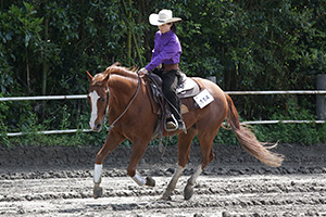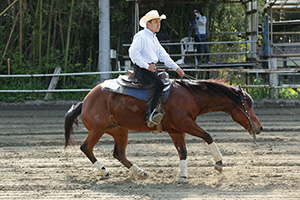 トップに立ったのは、Hollywood Wooster 土岐田 藍(千葉県)で、サークルやストップなど無難にまとめて135.0ポイントをマークした。そして、0.5ポイントビハインドで2位につけたのが、Chics Top Cody 末廣 まどか(千葉県)で、スピンのスタートに少々手間取ったところがあったが134.5ポイントマークして優勝圏内につけた。3位につけたのは、Gold Flashy Jac 小林 孝之が130.5ポイント、4位につけたのは、Remarkable Step 増田 明子(千葉県)が130.0ポイントで、2nd Go Roundに望みを繋いだ結果となった。 そしてトップと2位につけた土岐田と末廣は、共に今シーズンから新しくコンビを組んだ馬での参戦であった。その新コンビの2組が、1位と2位を占めた結果となって、2nd Goの優勝争いが楽しみとなったのである。 Open DV 1stGo Round 首位に立ったのは、Just Dunit 土岐田 騰馬 Owned by 石塚 泰子(千葉県)で144.0ポイントをマークし、+1のスピンとサークルで圧巻のパフォーマンスであったが、スピンでのペナルティでスコアが思ったほど伸びなかったようである。 そして更に、土岐田 騰馬は Hollywood Wooster Owned by 土岐田 藍で139.0ポイント、Topsail Goldie Owned by 佐藤 一彦(千葉県)138.0ポイントをマークして、1・2・3を独占した。 The Day 2nd 4月24日(金曜日) Ancillary Class Ltd Non Pro DV