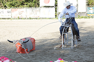 ほぼ全てのマヌーヴァー+1という圧巻の演技で152.0ポイントをマークして、ぶっちぎりの優勝を飾ったのは、Just Dunit 土岐田 騰馬 Owned by 石塚 泰子となった。ランインでスライディングストップアンドバックアップ:+1/2、ライトスピン:+1、レフトスピン:+1&1/2、レフトサークル:+1/2、ライトサークル:+1、ライトロールバック:+1、レフトロールバック:+1/2、スライディングストップ:+1 77.0ポイント トータル 152.0ポイント 2回走行合計 296.0ポイント。 準優勝は、Topsail Goldie Owned by 佐藤 一彦138.5ポイント トータル277.5ポイント、そして3位は、Hollywood Wooster Owned by土岐田 藍 136.5ポイント トータル274.5ポイントとなり、優勝、準優勝、そして3位を独占した土岐田 騰馬の完全勝利という結果となったのである。 番外となってしまったが名馬Eighty Six Classic 袴田 桂子(千葉県) Owned by 磯野 ひろ子(千葉県)は、1stGoでロールバックを失敗して0点となってしまったものの、2nd Goでは145.0ポイントマークしてチャンピオンホースここにありという存在感を示した。 Team Roping Dummy Header Non Pro DV