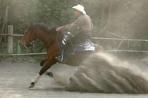 今年は、春の訪れが10日から1週間ぐらい早いようで、梅の散るのが早く、桜の開花が早く、そして筍の出るのも幾分早く感じる。 4月21日(水) 午前11時よりペイドウォームアップがスタートした。 One Day Before Ancillary Class Open DV Just Dunit 土岐田 騰馬(千葉県)Owned by 石塚 泰子(千葉県)がスクーリングのためのショーイングで、スコア71.0ポイントで優勝した。 4月22日(木) Non Pro DV 1stGo Round トップに立ったのは、Just Dunit 石塚 泰子 スコア207.0ポイント、ランダウンで少々馬のレジスタンスが見られたが、積極的スピードサークルで得点してほぼアヴェレージスコアをマークした。2位につけたのは、Moonlights Sailor 石山 真実(千葉県)スコア205.5ポイント、持ち前の切れ味の良いスピンやビッグストップの能力を少々抑え気味なショーイングで、2nd Goに期待したいものである。 3位につけたのは、Tomorrow Morning Caf 落合 身知子(埼玉県)スコア205.0ポイント、馬がリラックスしてイレギュラーなくスピンやチェンジリードをこなして優勝圏内に止まった。 Open DV Just Dunit 土岐田 騰馬 Owned by 石塚 泰子 スコア217.0ポイント、少々ランダウンでレジスタンスが見られたが、スピードコントロールやスピンなどの能力の高さを発揮して優勝に大手をかけた。 2位につけたのは、Lil Ruf Whip 袴田 桂子(千葉県) Owned by 長谷川 里絵 スコア 205.5ポイント、無難にまとめたもののスコアが伸びなかった。余談だが、このクラスにフルブラザーとフルシスター3頭エントリーしたのである。 Spooks Serenade 2008年 Chestnut Stallion Spooks Eldorado 2014年 Chestnut Stallion Royalprincess ED 2017年 Chestnut Mare 以上の3頭は、Sire Spooks Catfish (by Grays Starlight) Dam Hollywood Saranade(by Hollywood Dun It) の産駒で、エリートファミリーであり、今後の成長が楽しみで、後々はこの馬達が将来の日本のレイニングホースのクォリティを担う存在となることでしょう。 4月23日(金) Ancillary Class Ltd Non Pro DV Whizlin Whoaman(1998年 Sorrel Mare Age23) 林 雅子 スコア63.0ポイント、これまでない積極的ショーイングを発揮して、観客の大きな声援を受けていた。 4月24日(土) Non Pro DV 2nd Go Round 番狂わせといってはチャンピオンに失礼となるかも知れないが、1st Goでトップに立っていたJust Dunitは、レジスタンスでキックが入って5ポイントペナルティ敢え無く撃沈、次なる優勝候補のMoonlights Sailorは、ケアレスミスでブレイクゲイト2ポイントペナルティ、2頭の優勝候補の馬は、斯くして優勝の栄冠が両手からすり抜けてしまったのである。そして、2016年の優勝以来5年のタイムラグの後に見事チャンピオンの座についたのは、Tomorrow Morning Caf 落合 身知子 スコア209.5ポイント トータル414.5ポイント、ショーイング全般を通してリラックスした状態をキープし、スピン・ストップ・スピードコントロール・チェンジリードと無難にこなして、ほぼアヴェレージ得点をマークし並み居る強敵を下して栄冠を手にしたのである。 落合は、2016年にこの馬で優勝を果たしその後手放し、そして再びパートナーとなって数年、そして今回数段馬のレベルアップをして見事快挙を成し遂げたのである。 リザーブチャンピオンは、Moonlights Sailor 石山 真実 スコア205.0ポイント トータル410.5ポイント、スピン・ストップと+得点を稼いだもののブレイクゲイトの2ポイントペナルティがひびいて優勝を逃してしまった。ネクストショーイングのリベンジを期待したいところである。 Open DV Just Dunit 土岐田 騰馬 Owned by石山泰子 スコア223.0ポイント トータル440.0ポイント、プレジャーホースのようなスローダウンのスピードコントロール、全く軸がぶれずローヘッドでスタイリッシュなスピン、ディープでエキサイティングなロールバックとスライディングストップと全てのマヌーヴァーにおいて圧巻のパフォーマンスで223.0ポイントの高得点をマークして、他を圧倒して優勝を果たしたのである。リザーブチャンピオンは、Lil Ruf Whip 袴田 桂子 Owned by 長谷川 里絵 スコア209.5ポイント トータル415.0ポイント、運動不足気味の感は免れないが短期間で良くまとめたパフォーマンスを発揮して、2nd Goではほぼアヴェレージ得点をマークして準優勝に輝いた。 Team Roping Dummy Header Non Pro DV 決勝戦に駒を進めたのは、増田 明子(千葉県)と石山 真実の二人で、増田はスィングには美しさが見られ、決勝戦では残念ながら外してしまって得点することができなかったが、スタンディングでの練習を見る限りでは優勝候補筆頭であったが、惜しむらくは力強さがあれば申し分なく感じた。 優勝は、石山 真実 スコア72.0ポイント、キャッチングできたときの完成度は高いが、スィングとキャッチングの精度が不安定で、選手全員のレベルを見る限り圧倒的スキルがあるにも関わらず、成績が安定しないのは何故なのでしょう。 「編集後記」 継続して繰り返すと必ず上達するものだと思いがちである。 ボーダーコリーのHarveyに後肢2本で立ち上がる訓練をしていると、最初は一瞬立っていることが精一杯であ