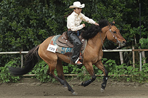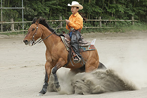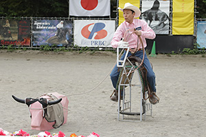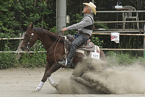 The Day 1st 4月19日(水曜日) AM 10:00ペイドウォームアップが、馬のスクーリングとして行われた。 PM 4:00 One Day Before Ancillary Open DVは、1エントリーがあったが、スクラッチとなってしまった。 The Day 2nd 4月20日(木曜日) Non Pro DV 1st Go Roundは、トップに立ったのがRemarkable Steps 増田明子(千葉県)で、139.5ポイントとほぼアヴェレージスコアで、不可ないパフォーマンスであった。これに続いたのは、Spooks Serenade 土岐田 藍(千葉県)137.0ポイント、Just Dunit 石塚 泰子(千葉県)135.5ポイントで、4ポイントの間に3人が競う形となって、この誰もに優秀するチャンスがある様相を呈したのであった。 Open DVは、Non Pro 同様3頭の三つ巴の闘いとなり、その中でのトップは、Royalprincess ED 土岐田 勘次郎(千葉県) Owned by 林 雅子(東京都)143.5ポイントで、サークルのスピートコントロールで得点したようであった。これに追随したのは、トップのPrincessとフルブラザーのSpooks Eldorado 土岐田 騰馬 Owned by 落合 身知子(埼玉県) 143.0ポイントで0.5ポイントの僅差であった。3位に付けたのは、Topsail Goldie 土岐田 騰馬 Owned by 佐藤一彦(千葉県)140.0ポイントとなったのである。The Day 3rd 4月21日(金曜日) Ancillary Open DVは、Moonlights Sailor 土岐田 騰馬 Owned by 石山 真実(千葉県)、72.0ポイントで優勝した。スピーディなサークルとアグレッシブなロールバックでの見事なショーイングであった。 The Day Final 4月22日(土曜日) Non Pro DV 2nd Go Roundは、1st Goで三つ巴であった一角のJust Dunit 石塚 泰子が、5スピンで優勝戦線からは敢え無く脱落してしまった。トップに立っていたRemarkable Steps 増田 明子は、141.5ポイントと確実にアヴェレージを超えるパフォーマンスで、優勝に大手を掛けた。そして、三つ巴のもう一人のSpooks Serenade 土岐田 藍は、チェンジリードで失敗し、2位には付けたものの首位に届くことはできず、Remarkable Stepsが2度目のNon Pro日本一の座に就いたのだった。 Open DV 2nd Go Roundは、1stGo のスコアの低い者からのドローでスタートし、3位に付けていたTopsail Goldie 土岐田 騰馬 Owned by佐藤 一彦は、143.0ポイント トータル283.0ポイントと高得点をスピンとディープストップでマークし、後続にプレッシャーをかけることとなった。続いて、2位に付けていたSpooks Eldorado 土岐田 騰馬 Owned by落合 身知子は、142.0ポイント トータル285.0ポイントと安定したマインドの強みを活かしたパフォーマンスで2位以上の座を確定させた。 ファイナルエントリーとなったRoyalprincess ED 土岐田 勘次郎 Owned by 林 雅子は、142.0ポイント以上で優勝という場面で、最初のストップで-1/2、ライトスピンが-1/2と序盤に69.0ポイントとなって、更なるプレッシャーがかかることとなったが、この馬の最大の武器であるサークルのスピードコントロールで、+得点を重ねて142.0ポイントを叩き出し、トータル285.5ポイントをマークし2位と0.5ポイントの僅差で、2022年の最終戦に続いて2連覇を果たしたのだった。 Team Roping Dummy Header Non Pro DVは、多くの者がルーズキャトルとなって、結局 増田 明子が最初にキャッチングを成功させ、ファイナルドローの石山 真実は、ファーストチャレンジでルーズキャトルとなったもののセカンドチャレンジで持ち前の実力を発揮し72.5ポイントをマークして、増田 石山の決勝戦となったのだった。そして、決勝戦ファーストドローの増田 石山ともルーズキャトル、2nd チャレンジで、ファーストスローの増田がルーズキャトル、石山は72.5ポイントで見事優勝を果たしたのだった。 「編集後記」 今大会は、初夏の陽気に包まれて絶好のグランドコンディションで開催された。 大会直前に新しいプロジェクトの提案があって、そのためだったのか、どのショーホースもそのフォルムが変わったように見えたのだった。 そのプロジェクトは、ファウンデーショントレーニングのちょっとした工夫らしいが、そのアイディアで馬が激変したのだそうだ。 次の大会は5月で、それまで1ヶ月といったところだが、そのニュープロジェクトの完成を見るのが今から楽しみである。 |