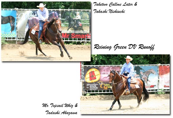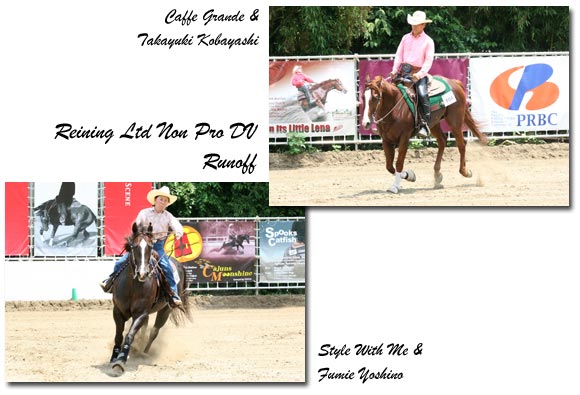 Ltd Non Proは本戦で、小林孝之(Caffe Grande)と吉野芙美恵(Style With Me)が132.0で同点。ランオフでは、小林が落ち着いて愛馬をコントロールし、堅実な演技を見せた。不得意だったスピンも丁寧にまとめ、ストップも豪快に決めて、念願だったレイニングでのバックルを初めて獲得した。吉野は90度以上のオーバースピンをしてしまい、Congressに続く夫婦そろっての連覇は果たせなかったものの、1日に3騎乗をこなすオープンライダーばりのタフネスを見せ、年齢を感じさせなかった。 Greenディビジョンでは本戦で、西内高志(Taketwo Callme Later)と赤澤正(Mr Topsail Whiz)が136.0で並んだ。ランオフでは、西内が攻めのライディングを見せる一方、赤澤は丁寧なショーイングを披露。結果は西内に軍配が上がったものの、見ごたえのある一騎打ちを演じた。