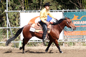 同じ大会に出場しているライバルとして、石山に2つのバックルを持っていかれるのは、悔しい。そう感じていたライダーも少なくなかったに違いない。だが、初日に大雨にたたられた大会を、ともに盛り上げてきた仲間同士でもある。一種の連帯感が、大会に花を添える快挙への期待と変わり、馬場を見つめるライダーたちの胸に膨らんでいった。 そんな雰囲気の中から外れていたのは、石山本人だけだったかもしれない。愛馬、Smart Wimp Olenaの馬上で出番を待つ石山は、両ディビジョン制覇の可能性があることに全く気付いていなかった。ただ、これから出て行く馬場でしなければならないこと、その1つ1つに意識を集中させていた。妻の尚子も、余計なプレッシャーを与えないようにと、あえてダブルチャンピオンの可能性については口にしなかった。 ゲート番が合図を送った。石山は馬場に入ると、まず馬がフェンスに寄って行かないように注意した。脚を馬体に軽く当て誘導する。センターのライン上まで来るとゆっくりと正面を向かせ、さらに歩かせる。センターで止めて馬上で後方を振り返り、前後のパイロンの間にいることを慎重に確認した。 パターンはNRHAのナンバー5。最初のマヌーバは左サークルだ。脚とレーンを使って馬の集中を高め、フレームを整える。右の脚を馬体に当てると、呼応してヒップが入り、舌鼓の合図とともに、馬はゆっくりと駆歩を始めた。 2日前の雨がうそのようだった。空は晴れ上がり、馬場のコンディションも回復していた。「The 1st Pacific Breeders Circuit 1st Scene 2008」の最終日となった3月22日。Non ProとInt Non Proディビジョンの2nd ゴーラウンド。ライダーたちの注目を集めながら、石山の乗ったSmart Wimp Olenaは、栄光に向かって一気に加速していった----。 1/8 Next>> |