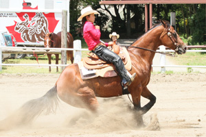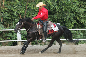 Reining Non Pro DV・Int Non Pro DVの 2nd Go Roundは、本番前のウォームアップでは多くのライダーがクオリティの高さを見せ、イージープラス1/2ポイントのサークルとスピンで、プラス1のスライディングストップを至る所で見ることができ、誰が勝つか、それに逆転も波乱も予想ができるものではなかった。 ところが蓋を開けてみると、何と1st Goトップの石山がオーバースピンでペナルティ0となって優勝脱落。石山選手が終わった段階では、残っている落合選手とRowdy選手で、他の選手は1st Go Roundでオフパターンをしてしまっていた。 こうなってみると勝負はわからない。もし落合選手までもが0になってしまえば1st goで0になってしまった人馬にも2ndで高得点を取れば優勝の可能性が出てきたのである。 そんな不穏な空気の中、2nd Sectionで一躍Dreams Of Chics と新井俊一選手がスピン・ストップで持ち味を活かし141.0ポイントとハイスコアを出してみせる。 そして、Drawも終盤となり、落合 身知子選手とLil Ruf Whipの出番となり、スコアさえ取れば優勝が手に入るのが確実となったのだが、プレッシャーも相当のものであったのか、最初のマヌーバのストップバックの後、何とレインを落としてしまったのである。「万事休すだぁ。」 Int Non Pro DVは、トップタイだった小林孝之選手とBlack Cafがオフパターンとなって優勝脱落し、プレッシャーを跳ね返した石山 尚子選手と La Tigre Del Cieloに軍配が上がった。 石山選手は、ロングリードでペナルティをもらったものの、積極的なスピードコントロールを披露し、135.0ポイントを獲得して優勝の栄冠を見事手中に収めたのである。 1st Sectionは、衆意の予想通りCaf Jennyが頭角を現し、イージープラス1/2のスピンを見せての積極的な演技で141.5ポイントを獲得し、Total 284.0ポイントをマーク。 注目すべきは選手としての勝利はもちろんだが、トレーナーとしての勝利であることもいえる。 パフォーマンスの精度は、馬の疲労度がとても深く関わってくる。その状況下で高評価を得ることができたのは、演技中の技術だけにとどまらず、そこに至るまでの調整にも評価をされるべきであり至難の業だったはずだ。 優勝スピーチでは、土岐田は「小林さんのお陰」と話している。
