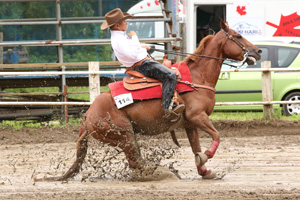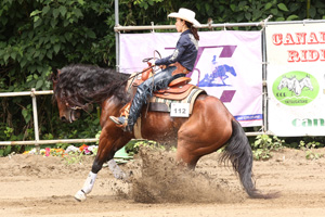 The 31st EWPC Congress '14 本大会は、日本で最も歴史が長くレベルの高い競技大会で、2014年は第31回を迎える。 馬場コンディションは、レイニング競技においては最も大切なファクターであるものの、前日からのスコールで、それまでベストコンディションであったのが一気に不良馬場となって初日を迎えることとなった。 The Day 1st 6月26日(木) 午前10時に開始した第1競技のNon Pro DV は、名実共に日本一のノンプロのライダーと馬を決定するクラスで、その1st Go Roundである。 トップに立ったのは、Gold Flashy Bearと増田 明子選手(千葉県)で、アベレージ得点に1歩及ばずであったが、最小限のペナルティに押さえたそつない演技であった。 第3位につけたのは、Bear Gold Flashと 藤田 生世選手(兵庫県)で、更に1ポイントのビハインドであった。 奇しくもトップから3位までの馬は、共にSire(父馬) Gallo Gold Cody Dam (母馬) Bear Paw Fiftyの産駒であり、特に母馬のBear Paw Fiftyは、昨年PRBC史上初の10,000,000円Damに輝いている名馬であった。