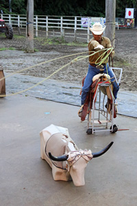 残年ながら初日の地位を堅持できなかったもののリザーブチャンピオンに輝いたのは、Gold Flashy Bearと増田 明子選手(千葉県)で、2013年の本大会で 2nd Go Roundを故障で棄権した悔しさをリベンジした。 そして、3位に輝いたのは、Ltd Non Pro DVで2連覇した Dunits Pepper Doll と 末廣 まどか選手(福岡県)で、2015年は、名実共にノンプロへの昇進を確実なものにした。 Open DVは、初日トップ通過をしたShesa Reincarnationと 袴田 桂子選手(千葉県)は、故障により棄権し2連覇を残年ながら断念した。 Cajuns Moonshineと土岐田 騰馬選手(千葉県)が、高得点を叩き出したのをはじめBrighten Gold と土岐田 勘次郎選手(千葉県)が追随して、ラストランのFifty Nifty Goldは、既に午前中Non Pro DVで優勝を果たしており、ここでトップに立てば、今日が名実共にJohn (Fiftyのニックネーム) Dayとなる可能性もあって、そのプレッシャーは最高潮に達した。 しかし、そのプレッシャーなど歯牙にもかけず、+1のグレートストップと+1のナイスサークルを展開して、チャンピオンの座に文句の付けようもなくついた。 そして、Fifty Nifty Goldは、Non Pro DVと Open DVの2冠を達成したのである。 Team Roping Dummy Header