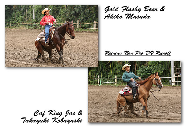 Team Roping Header Non Pro DV いきなり73.0ポイントの高得点をマークしてトップに立ったのが石山 真実(千葉県)で、スィング&スローイング・キャッチング・ダリーの3マヌーバー全て+1のパフォーマンスで、ファイナルへの指定席を確保した。 ファイナルは、石山と小林が見事なスローイングでタイスコアとなって、ロープオフに突入し、このままでは決着がつきそうにない様相を呈してきたので、ロングホーンキャトルにチェンジしてのパフォーマンスとなった。 一騎打ちのプレッシャーの掛かる局面で、石山がミスキャッチして脱落、更にプレッシャーの掛かるところであったがベテランの小林が正確にキャッチングして、チャンピオン席に着いた。 The Day Final 6月27日(土曜日) 初日二日目とベストコンディションであった馬場が、昨夜の雨で不良コンディションになって最終日を迎えることとなってしまった。 Non Pro DV 2nd Go Round トップスコアをマークして優勝を狙いたいところであったCaf King Jac 小林 孝之は、もう少しでオフパターンをしてしまいそうな大きなミスして、トップに抜け出すような得点を獲得できず、最後まで混沌とした優勝争いとなった。 また、優勝圏内にいたBlack Caf 落合 身知子(埼玉県) は、スピン・ストップと得点を稼げるパフォーマンスを見せながらもリードミスをしてしまって優勝争いから脱落した。 1stGo で、2位に付けていたGold Flashy Bear 増田 明子(千葉県)が、確実なパフォーマンスで大きなミスなく無難にこなした結果、Caf King Jacとタイスコアとなって、ランオフに突入することとなった。 そうして、息を呑む瞬間がやってきたのである。 増田本人がランオフになることを予想だにしていなかったため、1st SectionでショーイングしていたGold Flashy Bearは体を冷やしてしまっていたので、ランオフに向かってチャップスを付ける時間を惜しんでウォームアップに専念していた。 一方のCaf King Jac 小林は、淡々とランオフに向かって速歩をしながらイメージトレーニングに専念していた。 ドローは増田が最初でその後に小林という順で、ショーイングは双方とも馬の疲れが見えて切れの良いパフォーマンスとは言い難かったが、それでもGold Flashy Bear 増田 明子が1歩先んじて、Non Pro Championという栄光の座につき、乗馬歴18年にして初の快挙を成し遂げた。 ニュースターの誕生の瞬間であった。 Open DV 2nd Go Round 1st Go で1歩先んじていたStyle With Meと土岐田 勘次郎は、馬に多少疲労があったのかブレークゲイトという大きなペナルティを期して、得点を伸ばすことができず2位に甘んじた。 そしてEighty Six Classic土岐田 勘次郎が、馬場のコンディションをはね除けて214.5ポイント トータル427.0ポイントを獲得して、1stSceneとコングレスと連覇を成し遂げた。 3位は、Shesa Reincarnation 袴田 桂子で、馬場コンディションのせいで持ち味のストップに精彩なく、追い上げができず優勝を逃してしまった。 また、Whiz Sugar Dun 土岐田 騰馬は、セカンド ゴーでも馬場状況にも影響されない見事なスライディングを見せてくれた。 各ディヴィジョンの馬の入場する姿が、これまでとは格段に違ってきたように感じた。 クォリティの高さというのは、パフォーマンスで見えるものだと思っていたが、意外なところで人は感銘を受けるようである。 近い将来というより次の大会で、著しくレベルアップしたパフォーマンスが見られるに違いない。そんな予感をさせられた大会であった。 |