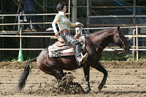 世間では、北朝鮮の脅威や衆議院解散の話題で沸騰していて、早々に夏が過ぎ台風による被害が各地で起きて天候の不順が取り沙汰されている。 10月5日(木曜日) One Day Before Ancillary Class 2 頭のエントリーであったが、本番に向かっての問題解消のためのショーイングで、Open DVは、Senoritas Nicky 土岐田 勘次郎(千葉県)Owner 石山 尚子(千葉県)が141.0ポイントで優勝、Green DVは、La Tigre Del Cielo 磯野 ひろ子(千葉県) Owner LTD Syndicate(千葉県)は、正しくスクーリングに徹して0ポイントとなった。 10月6日(金曜日) Non Pro DV 1st Go Round トップに立ったのはWhiz N Pep 川畑 弘清(東京都) Owner 長谷川 里絵(千葉県)で、+得点のスピンとストップで、アヴェレージスコア207.5ポイントをマークした。 そして、1.0ポイントビハインドで2位につけたのは、Lil Ruf Whip 落合 身知子(埼玉県)Owner 同エキジビターで、スタイリッシュでコレクトなスピンと安定したパフォーマンスで206.5ポイントであった。 上位2頭に3位以下は大きく差をつけられ、その要因はペナルティによるディスポイントであった。 従って、明後日のファイナルは、上位2頭の争いということになった。 Open DV 1st Go Round 前評判は、Eighty Sixの1強と云われる中、14年ぶりに参戦を果たした19歳馬のWhizlin Whoamanが、何処までそのポテンシャルや如何にといった様相を呈していた。そして、トップは221.5ポイントの高得点を叩き出して評判通りの結果を出したのが、Eighty Six Classic 土岐田 勘次郎 Owner 佐藤 一彦(千葉県)で、優勝のアドヴァンテージとなった。 2位につけたのは、214.0ポイントのSenoritas Nicky 土岐田 勘次郎 Owner 石山 尚子 で、ODAのスクーリングの成果の現れか積極的なスピードコントロールを見られた。 3位につけたのは、212.0ポイントとショー経験の浅い中、ストップスピンと堅実な成長を見せているRemarkable Steps 土岐田 騰馬(千葉県) Owner 増田 明子(千葉県)であった。 そして、207.0ポイントとアヴェレージスコアで4位につけたのは、14年ぶりに参戦したWhizlin Whoaman 土岐田 藍(千葉県) Owner WW Syndicate(千葉県)で、馬齢19歳でありながら往年のOpen Grand Championの片鱗を見せた。 10月7日(土曜日) Ltd Non Pro DV このクラスは、馬齢25歳と21歳と19歳と17歳という高齢馬の闘いではあったが、年齢を感じさせない大変見応えのあるものであった。今年Congress/ WJCで2連勝し、来シーズンワンハンドのクラスへの昇格を決めているLa Tigre Del Cielo 磯野 ひろ子(千葉県) Owner LTD Syndicate(千葉県)は、206.5ポイントと好スコアをマークし、自己最高のスライディングストップを見せたものの惜しくも優勝には及ばず、リザーブチャンピオンとなった。 そして、その磯野の自己最高のスライディングストップを乗り越えたパフォーマンスで優勝を果たしたのは、最高齢25歳ながら積極果敢なパフォーマンスで209.0ポイントをマークしたSmart Son 宮下 月見(北海道) Owner 同エキジビターであった。 北海道から参戦しているSmart Son は、エキジビターでもあるOwnerの宮下さんの言うことには、大会を終了した時点では、これが最後だという思いで北海道に帰るが、次の大会が近づいてくると前よりも良くなっているように感じ参戦する決断をするのだそうで、それを毎年繰り返しているように思うとのことであった。そして来年もまた。 10月8日(日曜日) Non Pro DV 2nd Go Round 見事に優勝を果たしたのは、2016年のFinal Sceneで優勝したディフェンディングチャンピオンの落合 身知子(埼玉県)で、Li Ruf Whipに騎乗し205.0ポイント、トータル411.5ポイントをマークして逆転し、その差はわずか0.5ポイントであった。前夜カツ丼を食べたそうで、これが功を奏したのかチェンジリードでペナルティを犯したものの、美しいスライディングストップを見せて、その栄冠を獲得した。 リザーブチャンピオンとなったのは、Whiz N Pep 川畑 弘清 Owner 長谷川 里絵で、コントロールされたサークルと見事なスライディングストップを披露し203.5ポイント、 トータル411.0ポイントをマークした。 前夜に行われたデモンストレーションクリニックで納得感があったようで、逆転されたのは悔しいが、手がかりを得てリベンジの意欲が旺盛になったようである。 Open DV 2nd Go Round 1st Go でトップに立ったEighty Six Classic 土岐田 勘次郎 Owner 佐藤 一彦は、何と抽選でファイナルエントリーとなって、プレッシャーマックスのシチュエーションとなった。 1st Goで2位につけていた Senoritas Nicky 土岐田 勘次郎 Owner石山 尚子 は、ロールバックでバックアップしてしまってペナルティ0を犯してあえなく撃沈した。このことも相まって、エキジビターにとって益々プレッシャーの高まる状況となったのである。 そのマックスプレッシャーをはね除けて、219.5ポイント トータル440.5ポイントと各マヌーヴァー+1を狙う攻撃的パフォーマンスで、ぶっちり優勝を果たした。 リザーブチャンピオンは、Remarkable Steps 土岐田 騰馬 Owner 増田 明子で、206.5ポイント トータル418.5ポイントとアヴェレージスコアまであと一息のと