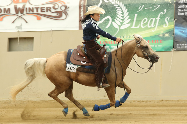 初騎乗より1か月目(10鞍目)で参加した12月CCRカップでは、競技中のCAFのメンタルの安定感と寒い中でのウォーミングアップの大切さを実感しました。3ヶ月目で参加した2月の九州ホースショーでは、伸びのあるサークルができるようになったもののリードチェンジでキックをされて、普段からの柔軟性を高める運動と直前のウォーミングアップの内容の大切さを実感しました。8か月目で参加したコングレスでは、サークルやリードチェンジが不安なくできるようになりましたが、勝つためのチャレンジ精神や馬の動きを良くするための思い切った騎乗がまだ足りないと思いました。10ヶ月目で参加したWJCでは、2日目のアリーナオープンで、初めての感覚になりました。普段クラブでやっている運動を、馬を感じながらゆっくり集中してやってみよう(ハミに対する馬の反応を、手綱を持つ手の感触でしっかり感じよう。拍車の圧に対する後躯の柔らかさをシートで感じようと思いました)すると、崩れないフレームと後躯の弾力をすごく感じたのです。そして、不安なく手綱を思いっきりルーズにして動かすことができました。